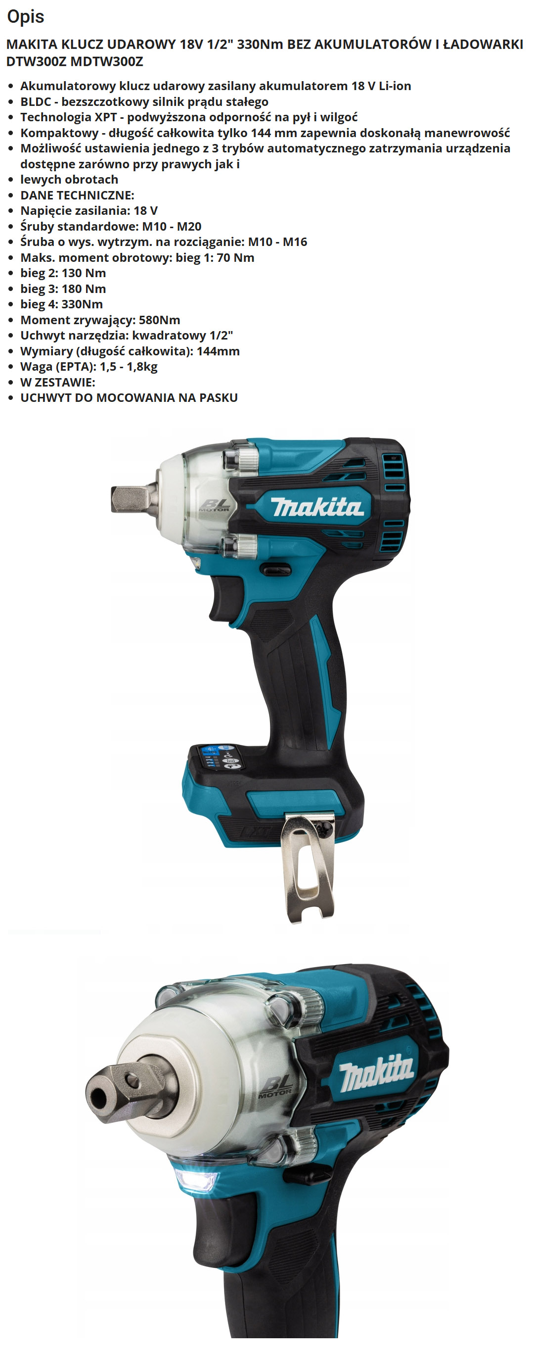 Klucz udarowy Makita DTW300Z Akumulatorowy Body LXT 18V Li-ion 330Nm+18V Akumulator litowy*2 + ładowarka